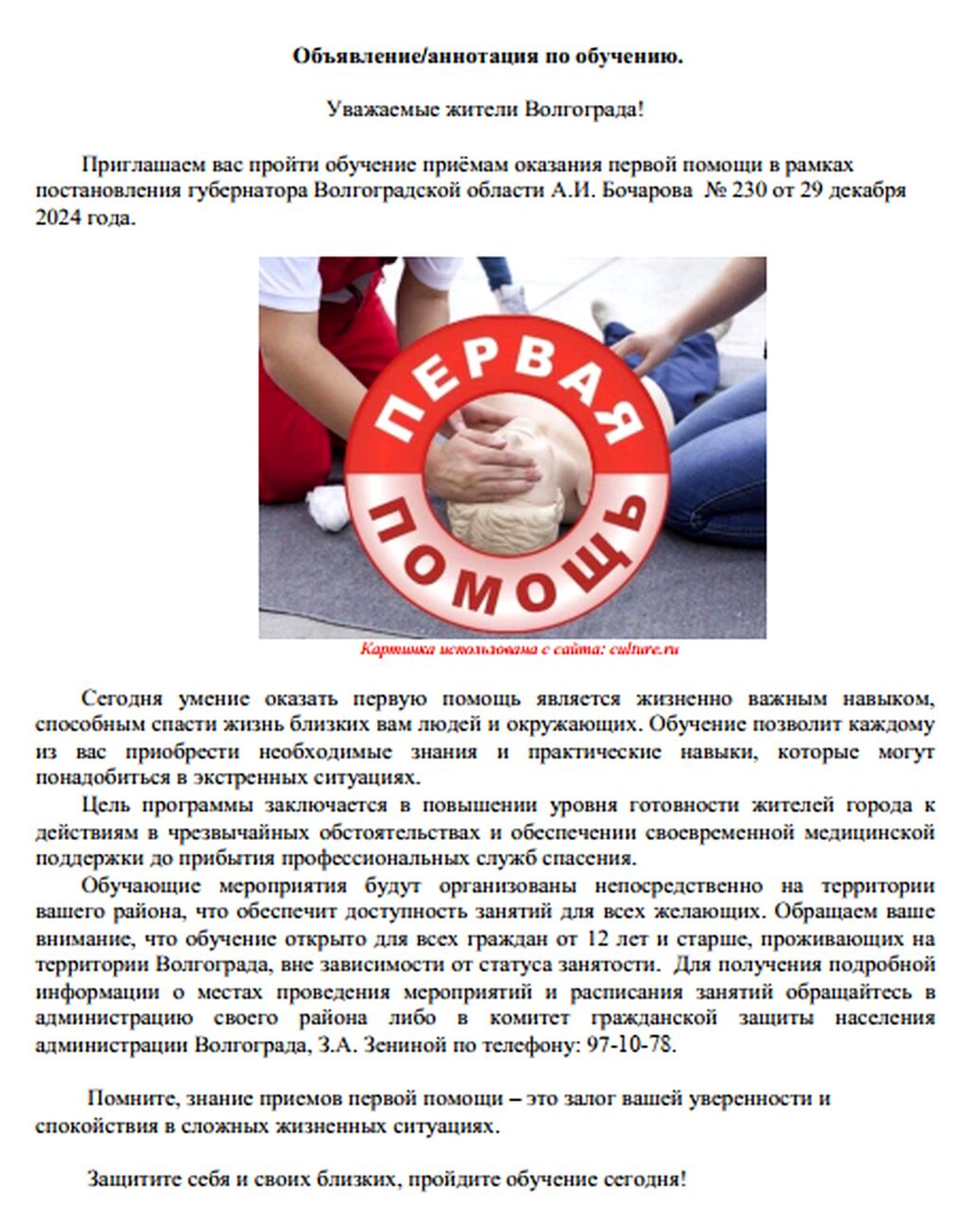 Приглашение пройти обучение приемам оказания первой помощи