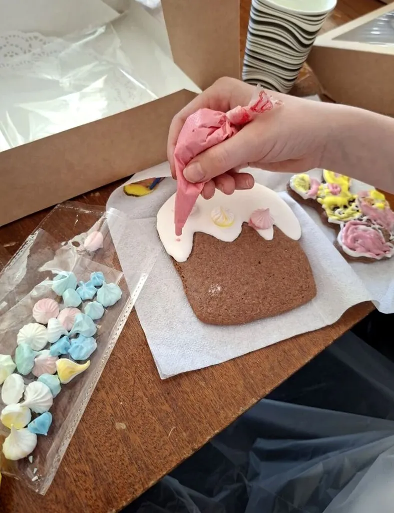 Также все желающие смогли освоить технику «мокрым по мокрому»: пряник заливается айсингом одного цвета, а потом добавляются точки другого цвета, расплывающиеся в кружочки.