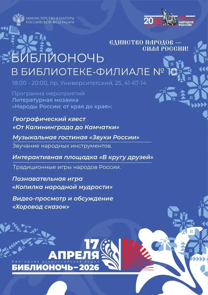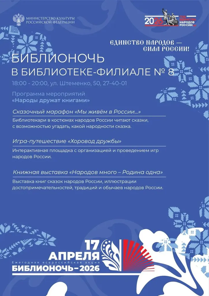 Для литературных гурманов – знакомство с творчеством писателей нашей многонациональной страны «Наш общий дом – Россия», экспозиция книг писателей народов РФ «Литературный мост дружбы», книжный экспресс «Вернисаж авторских книг разных народов» и выставка сказок и книг о достопримечательностях, традициях и обычаях «Народов много – Родина одна».